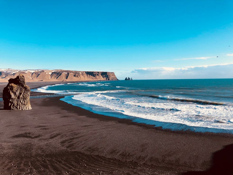 Reynisfjara is a black sand beach that quite literally rose from the volcanic ash that created Iceland. Walking along the beach, my boots were stained black from the ashy sand, while the salty smell of the North Atlantic engulfed me. I was actually warned not to go near the water, for the fear that a huge and sudden wave could pull me under. While beautiful looking, this beach is not gentle as it is covered in the fiery wrath of Mother Nature herself. Her wrath certainly provided us with an outstanding view.