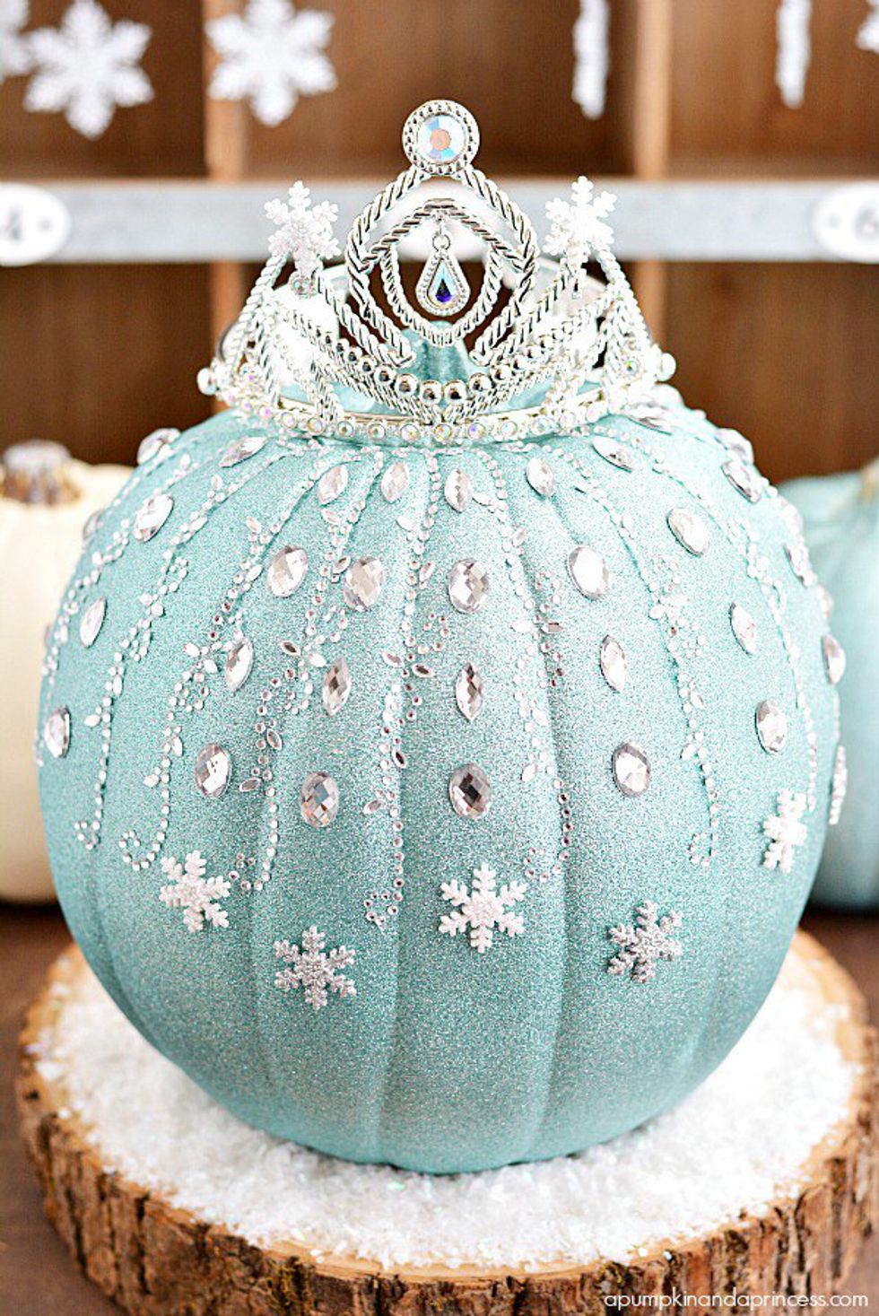 What you need: 1 pumpkin, silver rhinestones, hot glue gun, light blue paint, glitter spray paint (available here), paint brush and a plastic tiara.