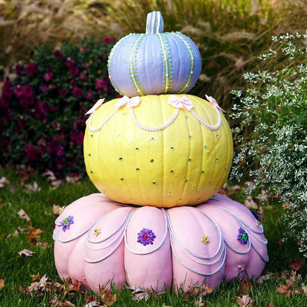 What you need: 3 pumpkins, pink, purple and yellow paint, assorted ribbons, rhinestones, small white bows and small assorted fabric flowers.