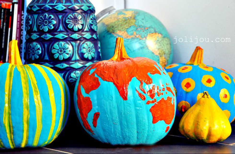 What you need: 1 pumpkin, blue and orange paint and a map (because who has the world map memorized?)