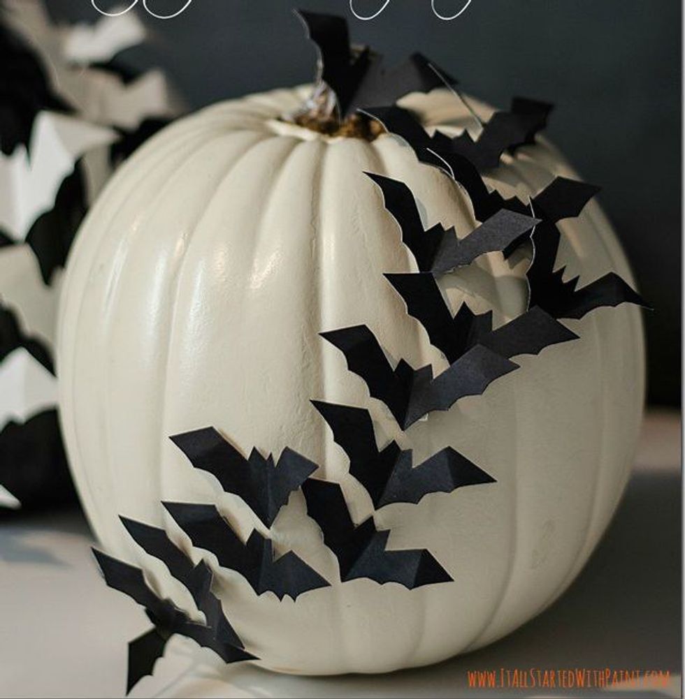 What you need: 1 pumpkin, white paint, black card stock, scissors and hot glue.