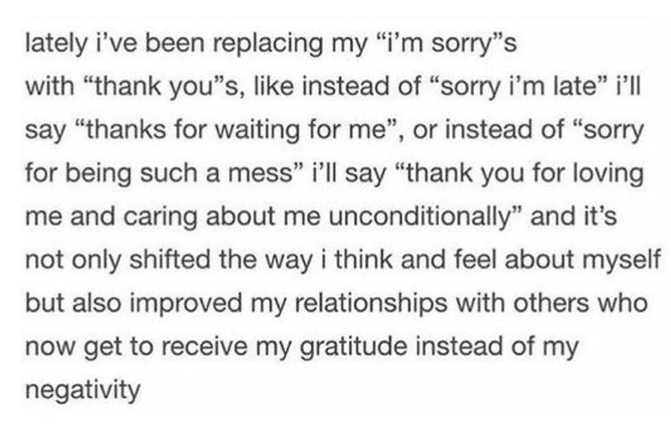 I stumbled across a quote the other day while scrolling through the Internet. It was something along the lines of starting to say "thank you" to those you have relationships with instead of saying "I'm sorry". I know I am someone who is guilty of constantly apologizing for things that do not seem to need an apology.