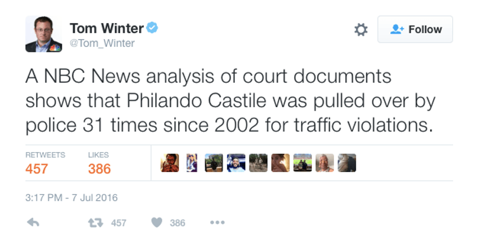 After his death, NBC journalist Tom Winter tweeted that Castile had been pulled over by police 31 times for traffic violations since 2002.