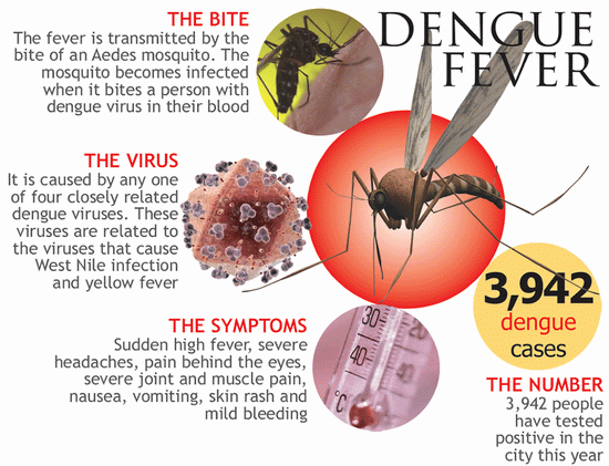 Also spread by mosquito bites, this virus commonly infects people in tropical areas such as Hawaii, Puerto Rico and Latin America. One may experience rash, fever, joint pain and serious bleeding. Dengue is not deadly, but can cause death if complications arise. Complications and death is more likely if you are infected with the virus more than once. Four hundred million people are infected each year.