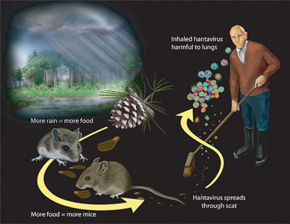 This virus normally infects rodents and does not cause disease in the animals. But if a human comes into contact with infected rat feces, it can make them very sick, The virus is characterized by fatigue, muscle aches, vomiting and abdominal pain. As the disease state progresses, the person starts to experience shortness of breath and coughing as the lungs fill with fluid. The mortality rate is 3 percent with treatment from a medical professional.