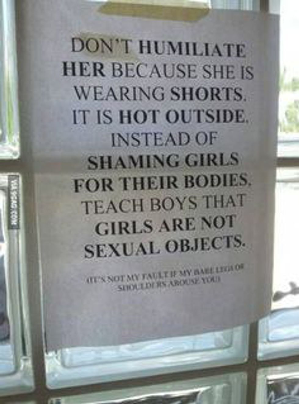 These are just a few examples of how my school takes dress code too far. Several of the rules we have in place are reasonable and are there to create a safe and focused learning environment, but some are there because of years of human conditioning that has made people believe that sexualization of girls' bodies is the norm and we should do everything in our power to make girls cover up and not teach boys how to control themselves.