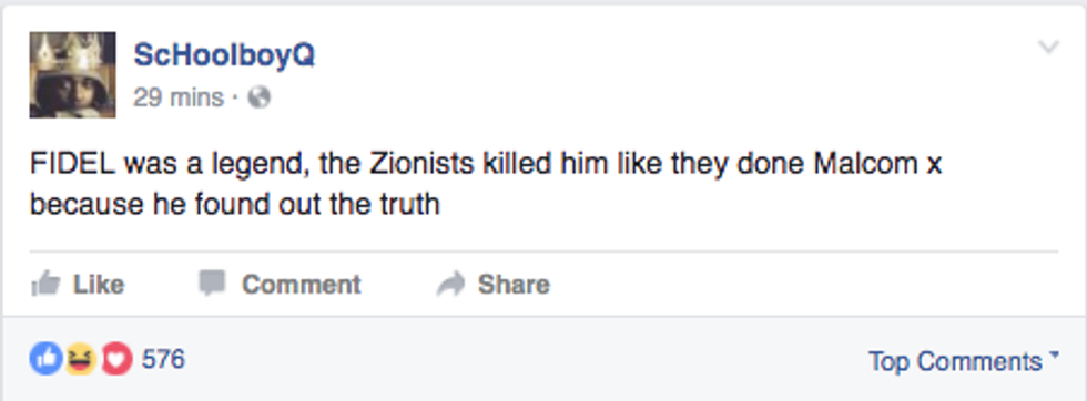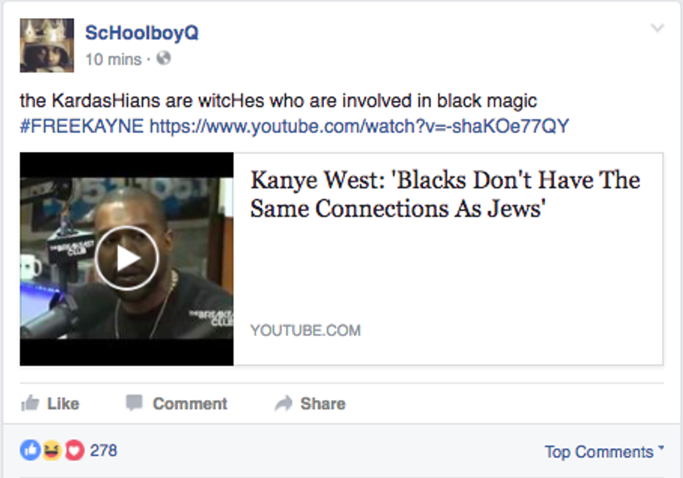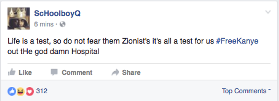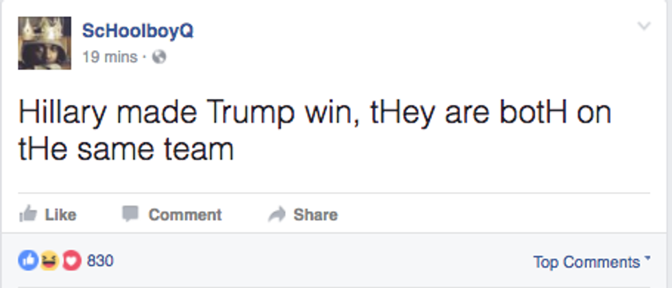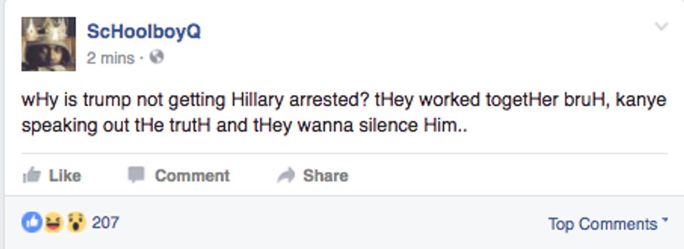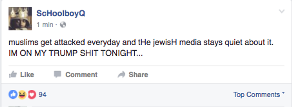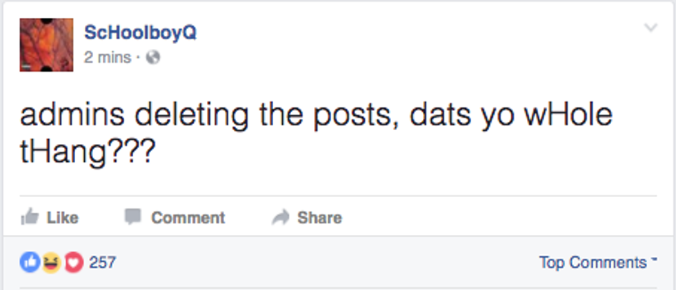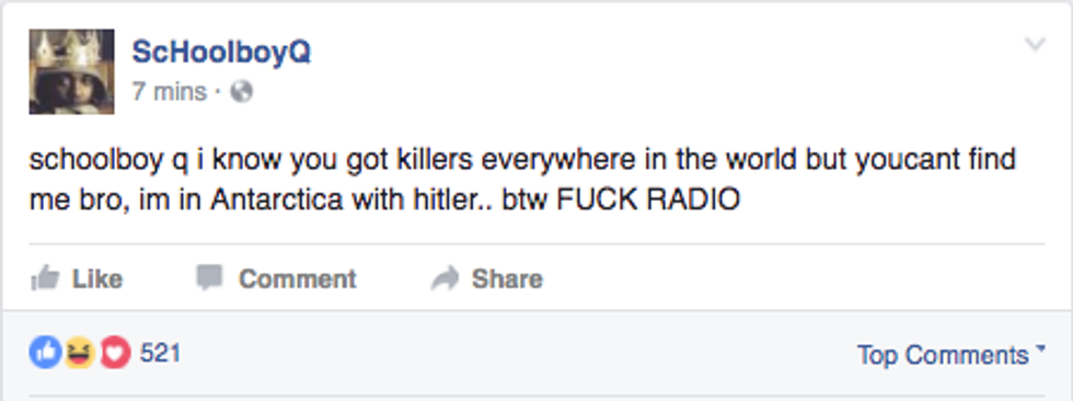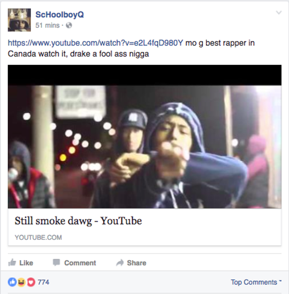 Earlier today, ScHoolboyQ fans around the world woke up to some revelations from the Blank Face LP artist. The series of disclosures began with a claim that some Canadian rapper was the best in the region and better than Drake, calling the Toronto-native a "fool ass n***a." ScHoolboyQ's Facebook account continued to shout out several unknown artists, which was a red flag that this might not be Q himself. Nonetheless, the hacker continued to spew out nonsense, entertaining the artist's 2 million followers.
