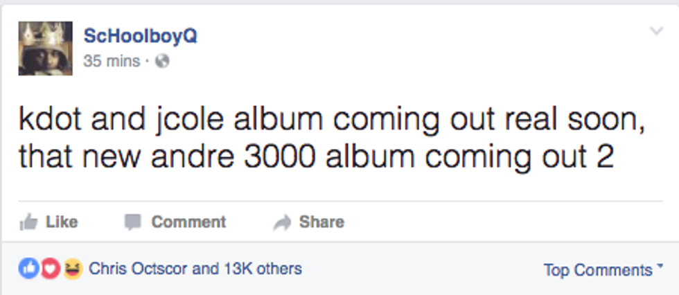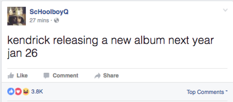 Q's Facebook account went on to reveal that fellow Top Dawg Entertainment and Black Hippy artist Kendrick Lamar had an album on the way along with J. Cole and Andre 3000. This statement stood to some, seeing as though the hacker had access to ScHoolboyQ's private messages and the announcement could possibly be a true leak. He even provided a date for Kendrick's album, stating January 16 of 2017 as the release date.