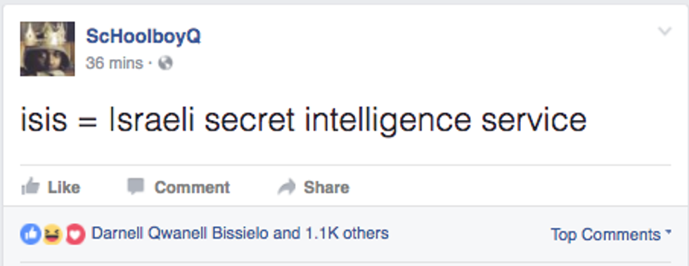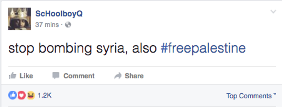 As the trolling continued, ScHoolboyQ's posts shifted from musical revelations to political statements of national importance. The first of these was one that most cannot disagree with: "the realest n***a that died this year was HARAMBE. RIP." Aside from this statement, the rest is essentially conspiracy theory nonsense. It was clear that the troll took a certain political stance that the real ScHoolboyQ himself will undoubtedly never take, at least not publicly, on the ongoing Israeli-Palestine conflict.