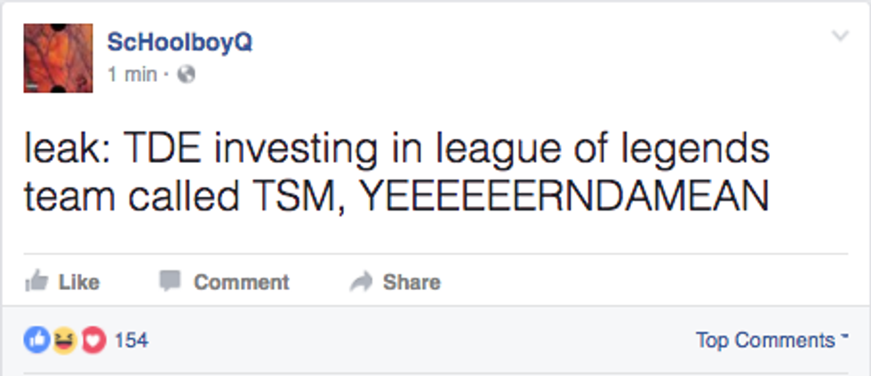 Of all the statements put out by SchoolboyQ's Facebook account, one that will have fans all over at the edge of their seat is that regarding albums by some of hip-hop's greatest. Due to the circumstances of the hack, these statements could easily be true. If that is the case, the world is in for a treat. In addition, there's something to be said about Top Dawg Entertainment's investment in League of Legends. If true, that is definitely a huge LOL moment, even more so than this roller coaster of a hack.