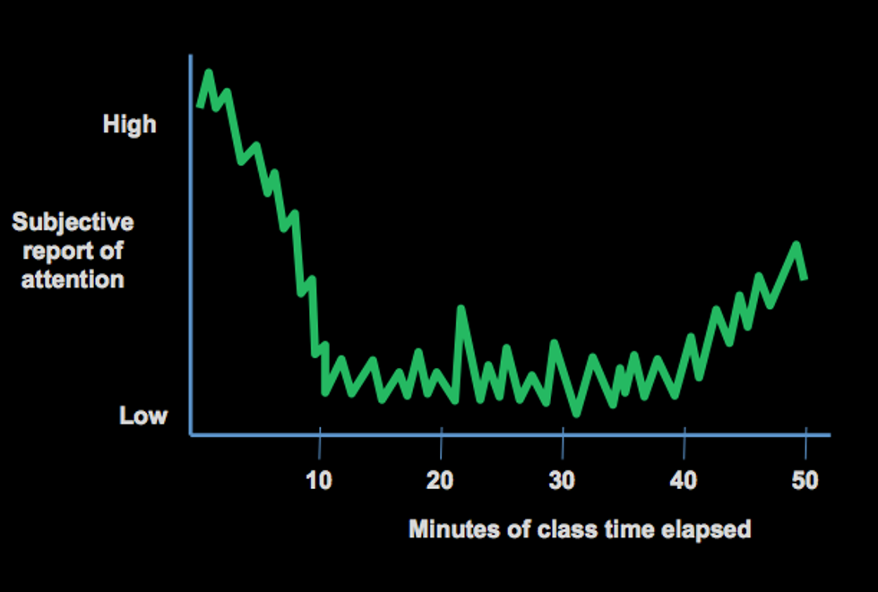 This shows that the student attention level decreases about 10 minutes into a lecture. This is the case with most classes, unless they are taught by a really good professor that knows how to keep his/her students’ attention. Unfortunately, as ironic as it sounds, most professors aren’t aware of learning processes and instructional theory. There needs to be more variation in classes rather than just straight lecturing. And there are multiple ways to do this, such as creating a student activity or asking questions.