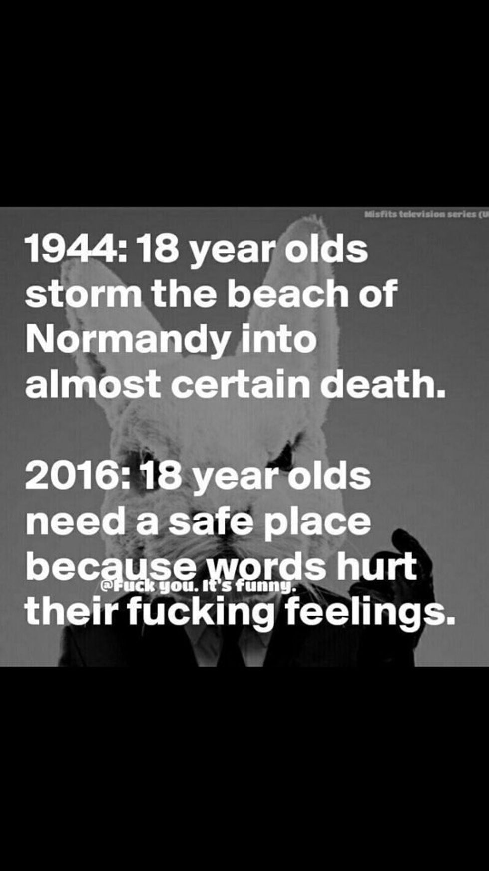 First, let’s deal with the second part of the meme: “2016: 18-year-olds need a safe place because words hurt their f***ing feelings.”