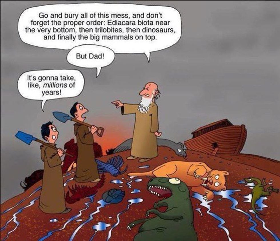 It featured a tyrannical Noah atop a soggy hill of dead animals, commanding two of his sons to dispose of the bodies. "Go and bury all of this mess," said Noah, "and don't forget the proper order: Ediacara biota near the very bottom, then trilobites, then dinosaurs, and finally the big mammals on top."