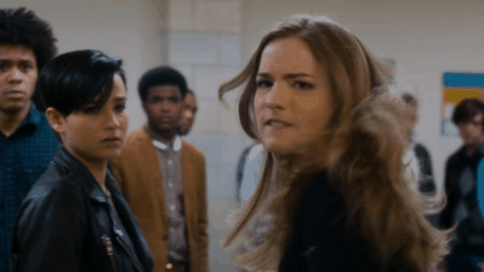 In a later scene after the unfolding events that lead Emma to finding Jake’s cellphone planted in her backpack, it’s now aware to us as viewers that the killer is inside the building. She overhears a girl named Haley Meyers talking bad about her. Fed up with all of it, Emma confronts her. An argument ensues to where Haley says all Duval’s are crazy, and what does Emma do? Slaps the shit out of her! This was completely unexpected but really showed how she is far from the fragile girl we met in season one. After the brawl Emma is escorted by Ms. Lang to an office where she can calm down as triggers from her PTSD are dwindling in her head.