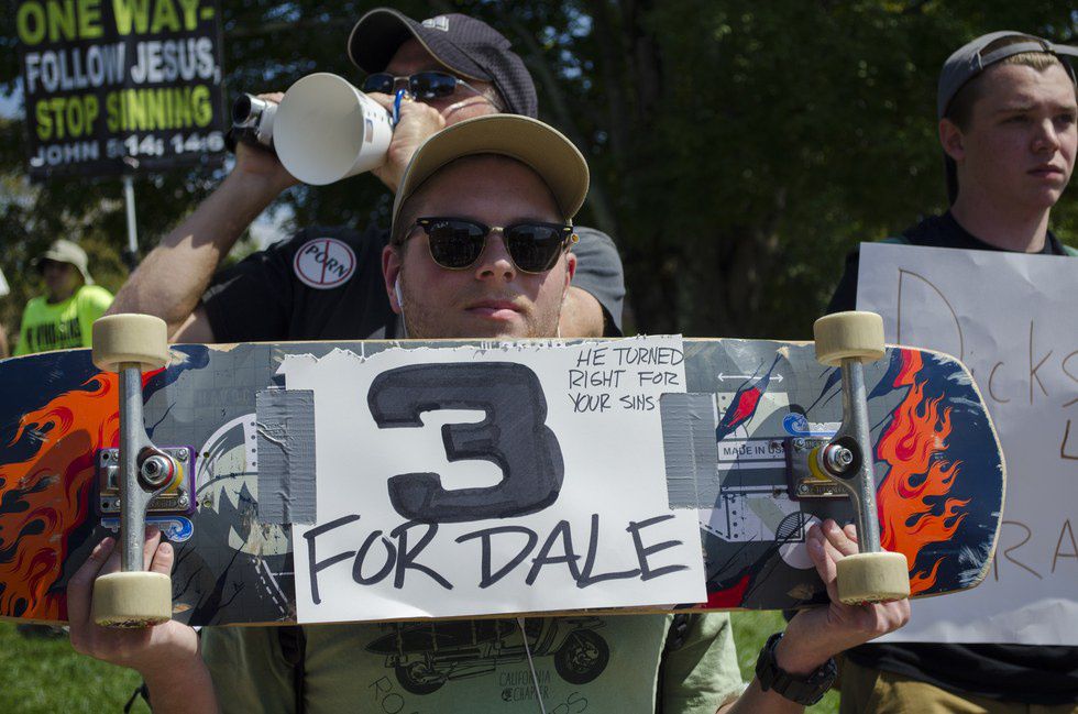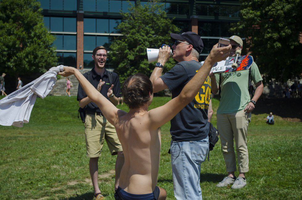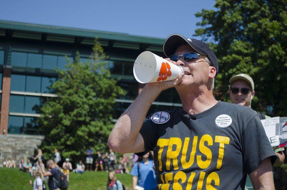 Last Tuesday I went to get pictures of people slacklining near the student union. Instead, I was met by a massive crowd of angry students facing a man screaming about Christ. I don't usually listen to what screamer preachers have to say since it can usually be chalked up to "all college students are going to hell." But that day I wanted some good pictures for a photography assignment, so I stayed, and I was sickened by what I heard.