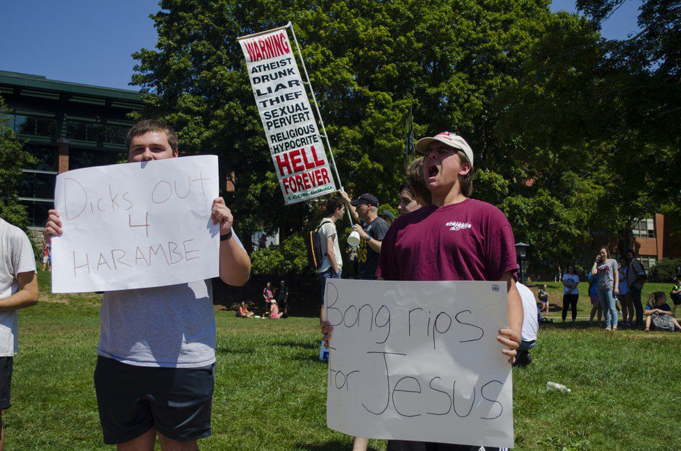 And to the guys holding up the signs that said "bong rips for Jesus" and "d***s out for Harambe," I'm not sure that I agree with your methods of protest, but thank you for standing up to intolerance.