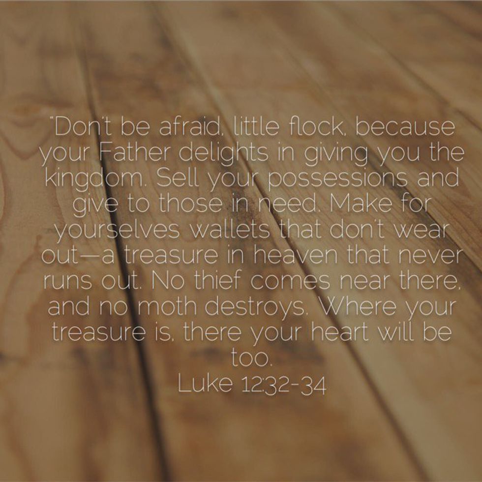 Don't be afraid about stuff! It's so hard not to think about the worries of money or the things you have. But God calls us to put our treasures in heaven, and there nothing, nothing can destroy.