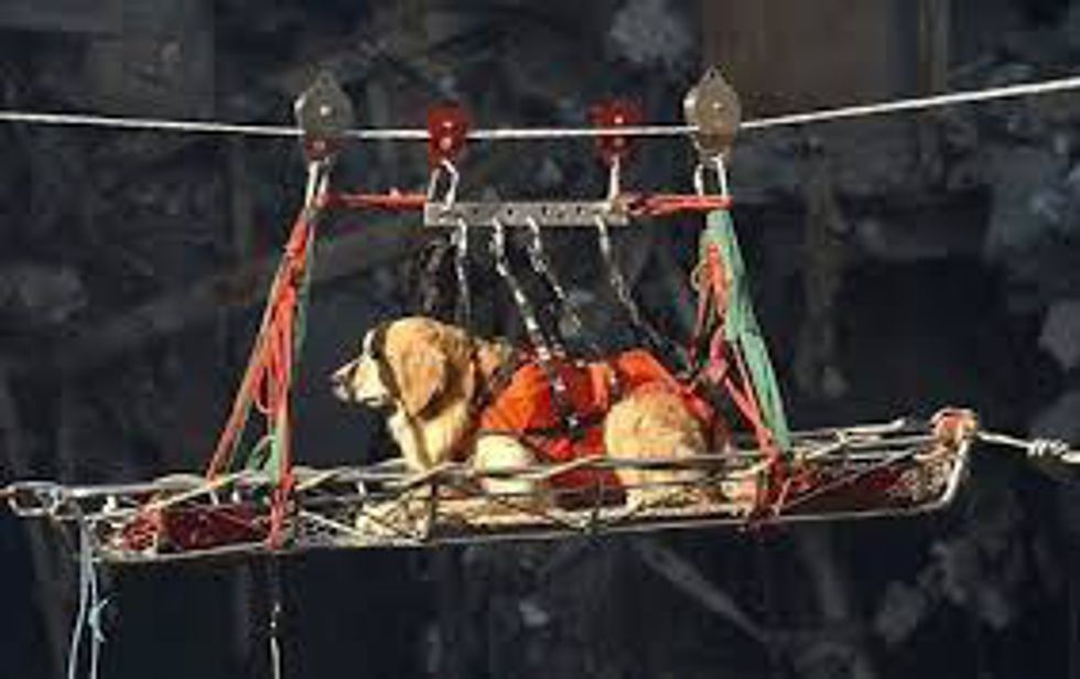 Riley, the golden retriever search and rescue dog on 9/11, being lifted away from a rubble pile.
