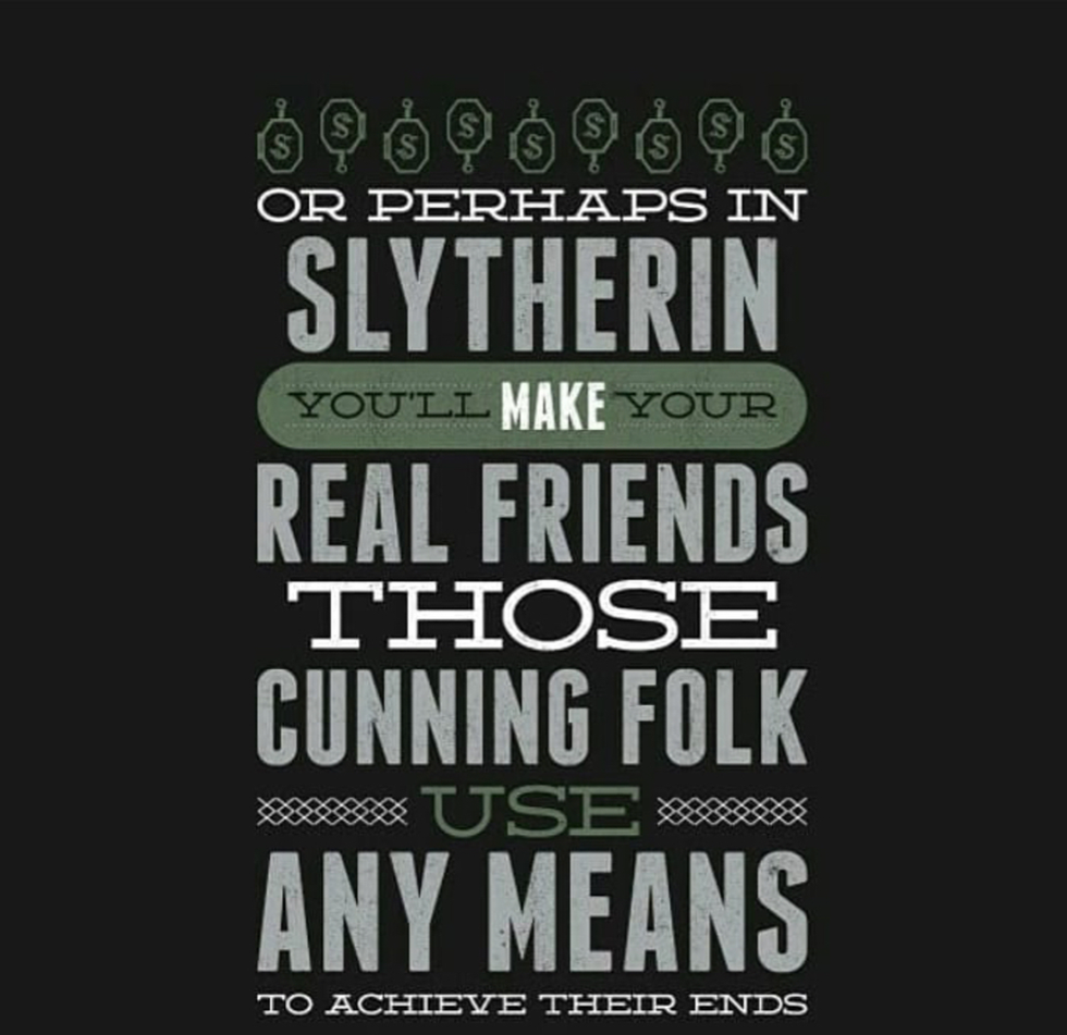 You know what it’s like to win, that sweet taste of glory, and you can’t ever forget it. Slytherin is your house because you won’t stop until you’re able to reach those glory days again.