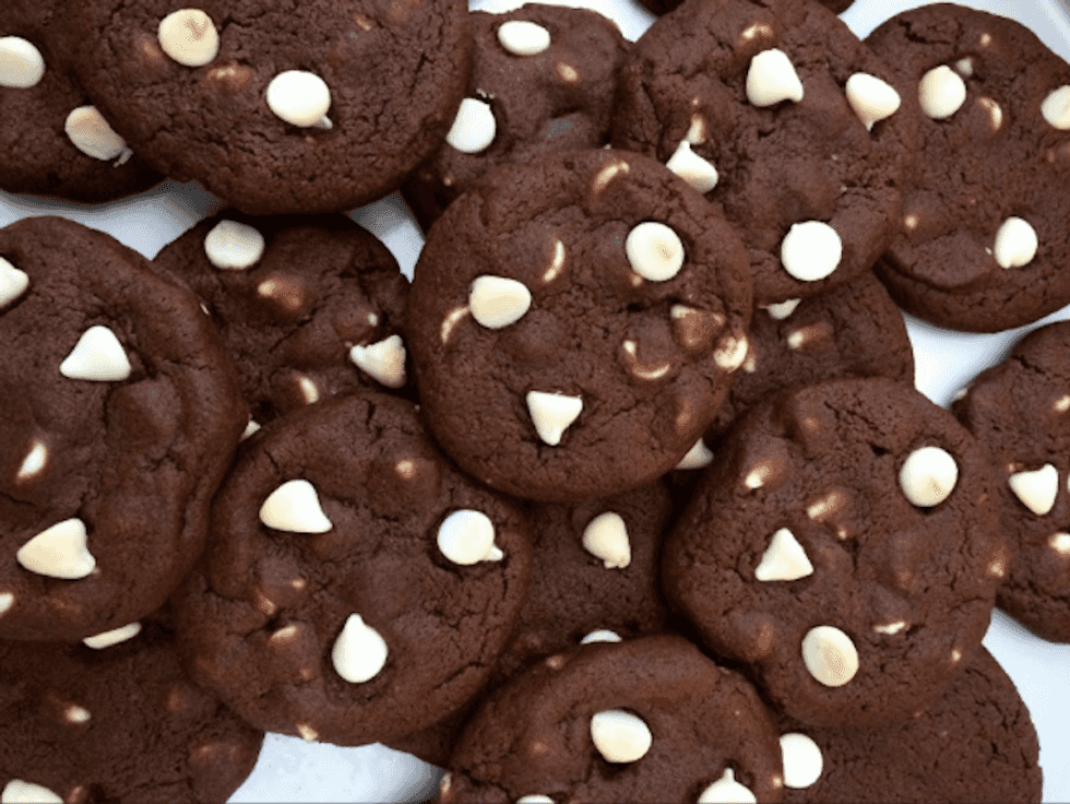 6. Using a measuring spoon, scoop 2 Teaspoons of the cookie dough to form a small rolled ball, you should have around 24 dough balls. I usually spread them out on a If foil-lined pan 2 inches apart (about 8 to a pan, 3x2 and then placing 2 more dough balls in the middle to fill extra space.) Press each dough ball down to where it is flattened but still thick (About 1⁄4 or so thick) and add extra white chocolate chips to the top to garnish.