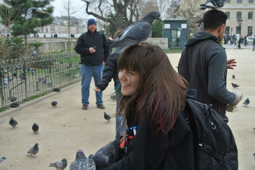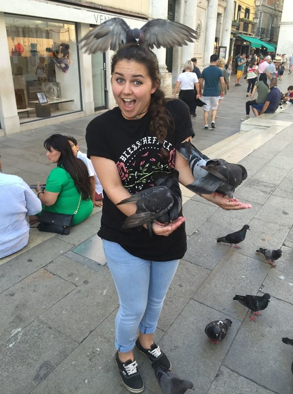 When we got back to St. Mark's Square, we shopped around before we found a man who was feeding pigeons. Three out of four of us had gone to France four years prior and we HAD to reenact some pigeon pictures.