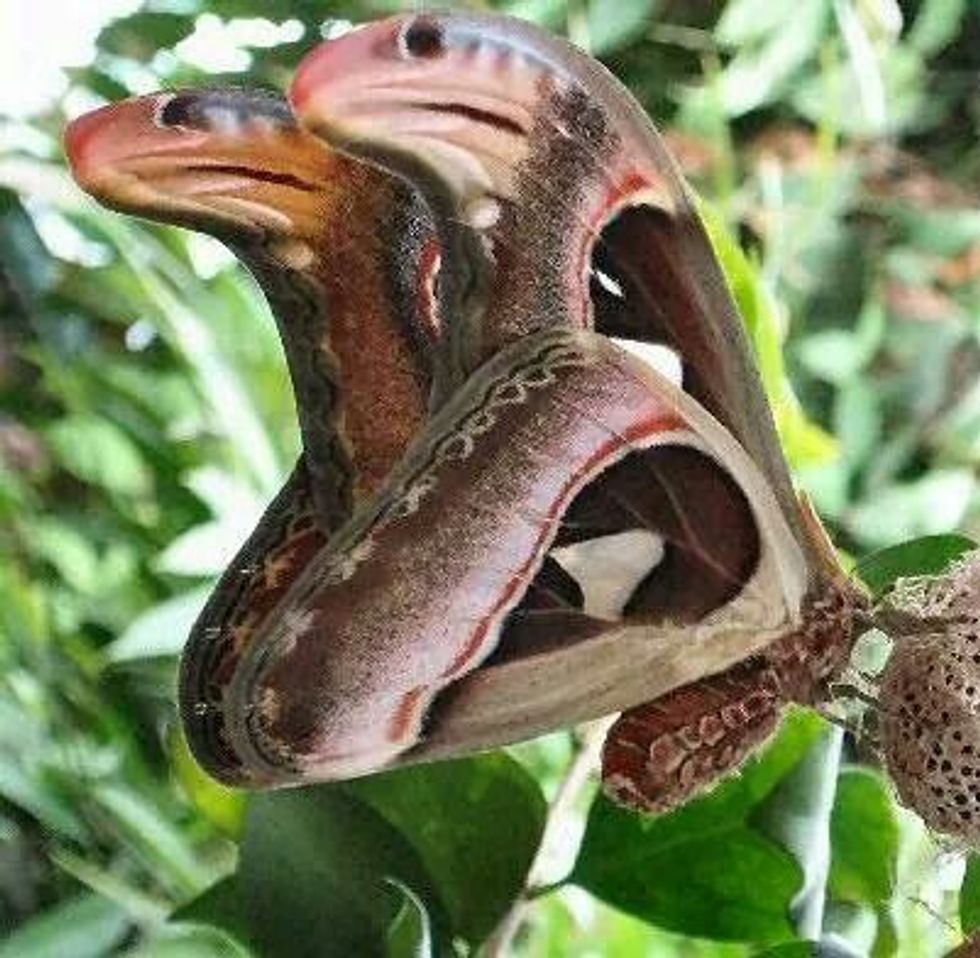 Hold on a quick second. Those are no snakes, that there is the Amazing Atlas Moth! Mimicking a spooky snake stance ready to pounce, predators are scared away. Foolish creatures got bamboozled again.