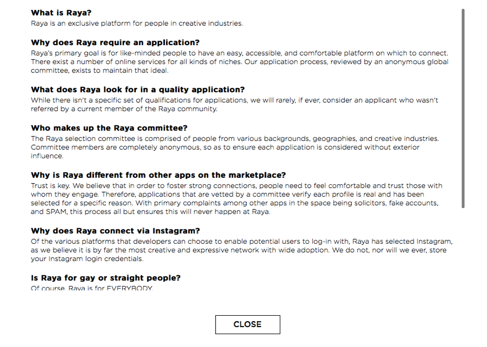 The app is called Raya and was released in March 2015. All members have to apply for membership and they ask you to affiliate your Instagram account with your application as well as pay a membership fee of $8/month. There wasn't much on the Raya website about anything really and when I say there wasn't much I mean Raya made it as low key as possible.