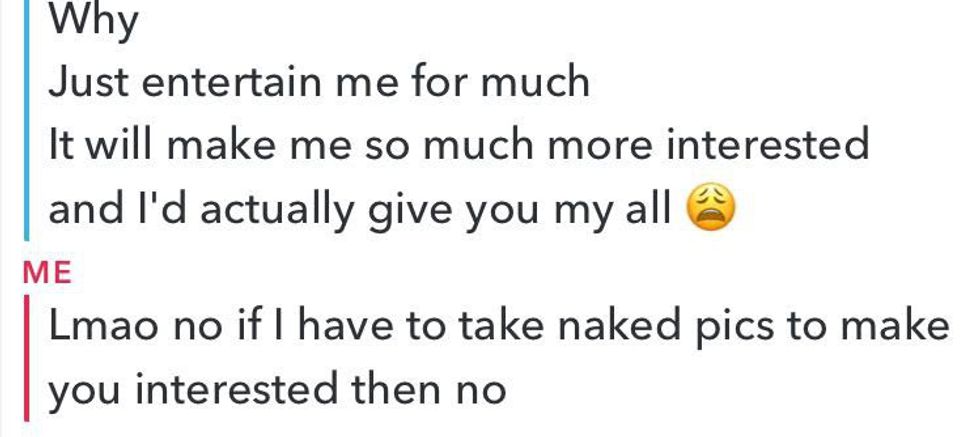 Let's get one thing straight just because you're bored and you have a penis does not mean I am in charge of keeping it entertained. ALSO, this is why our generation is so messed up. If need to send you nudes in order to make you interested in me? BOY, BYE!!