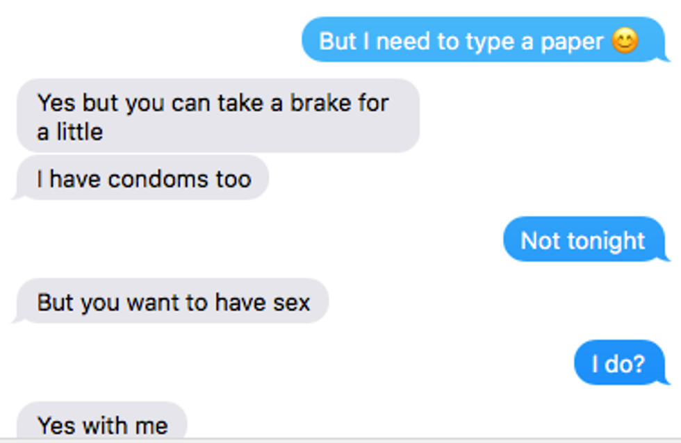 Ohhhh I know what went wrong here, I typed a smiley face. I forgot it was the universal sign for "I want you." Side note: he doesn't even know how to use the correct form of break.