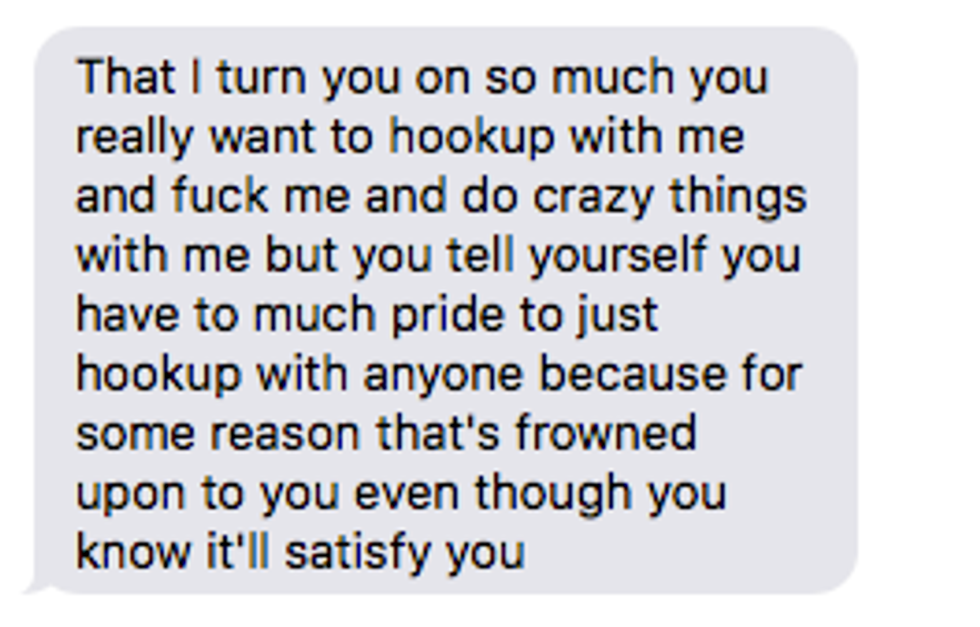 Here it is ladies, the mother of all mothers. At first glance it seems like it may be a decent text because it's long, right? WRONG. This boy was politely denied but that tore down his ego so he decided to claim he knows what I'm thinking. I don't say no to hooking up because of my ride, it's because I don't want to hook up.