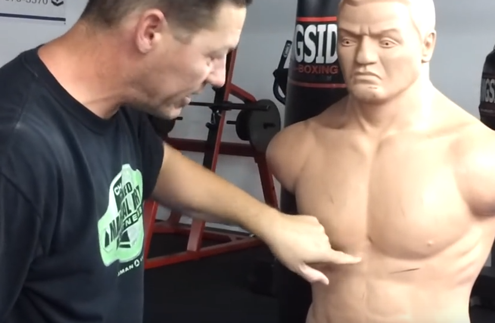 As mentioned above, a good first line of defense against a frontal assault, including punching and hitting as well as grabbing, is an elbow to the solar plexus, located right below the rib cage and centered at the top of the stomach. As the elbow is hard and durable, a quick jab to the area forces the attacker to double over and retract in, allowing you time to back on up outa' there. While the one arm jabs, the other can be hooked upwards in a 90-degree angle in front of you with the forearm facing outward to protect the head from incoming blows.