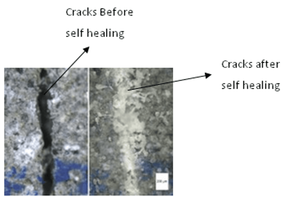 When the crack appears on the concrete, water flows in and activates the bacteria. the bacteria then undergoes simple chemical reaction forming limestone. Limestone then bridges the gap, thus, healing the concrete.