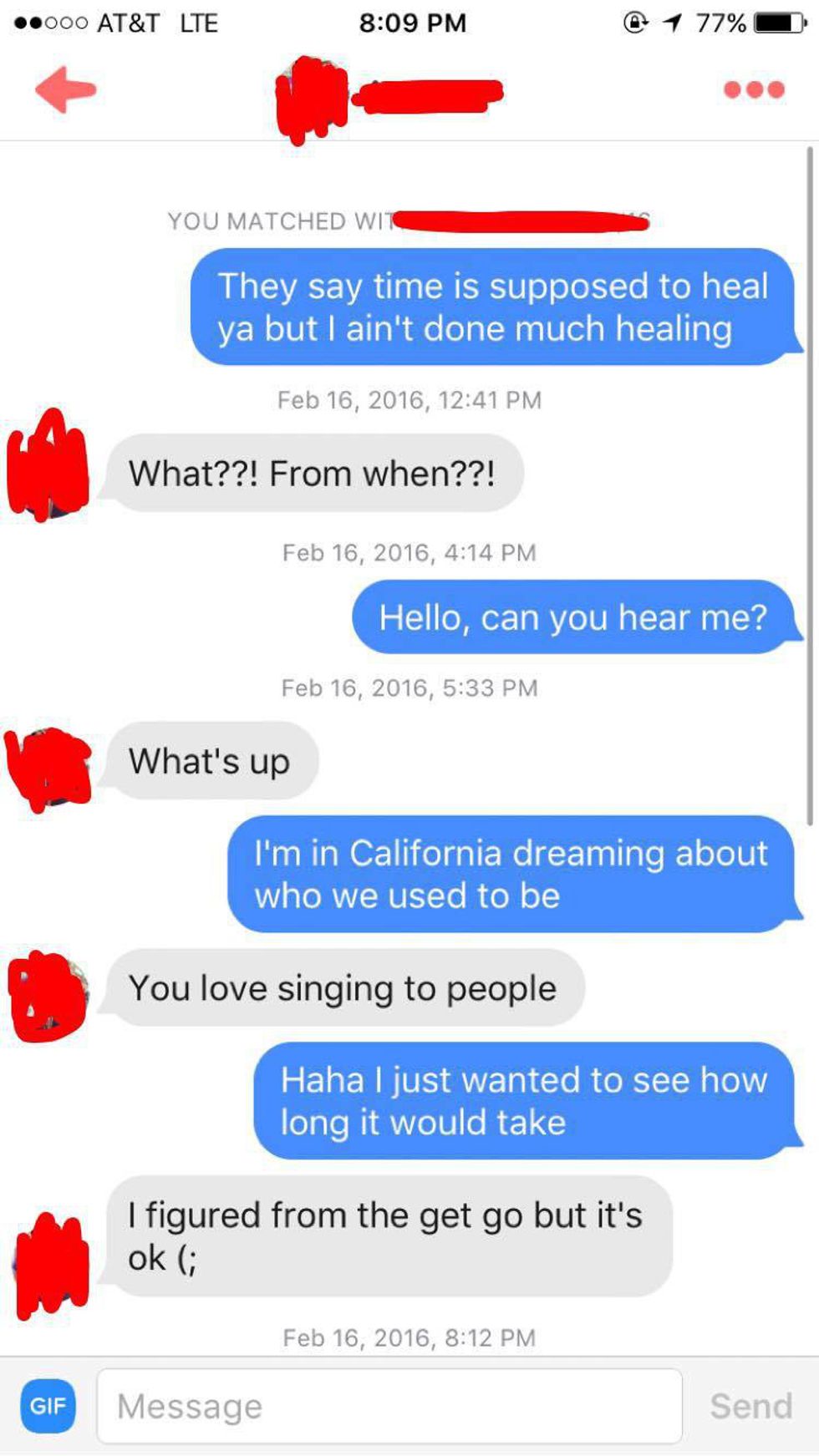 With a community of people with such diverse motivations, you never know what to expect. So that's exactly what I decided to become: the unexpected. I went not-so-undercover on Tinder with the singular purpose of messaging guys using only popular song lyrics. So, without further ado, here are some of my exchanges on Tinder feat. Selena Gomez, One Direction, and, of course, Taylor Swift.