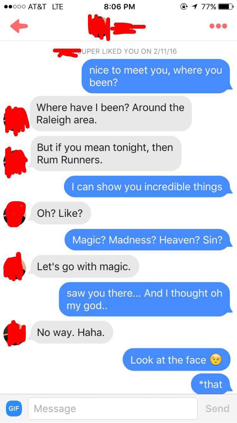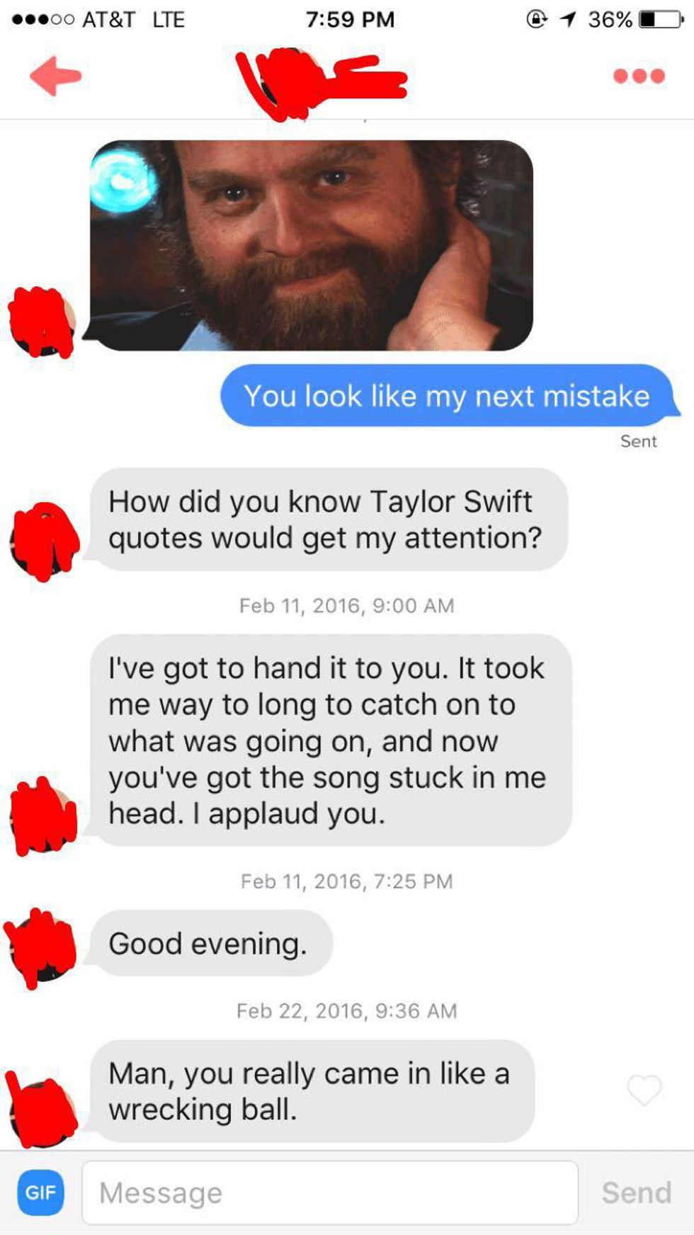 Hands down, my favorite conversation of them all. When in doubt, Taylor Swift. Honestly speaking, "you look like my next mistake" is pretty much my thought process when I see a cute guy. Kudos to this guy for playing my own game right back at me. Snaps for you.