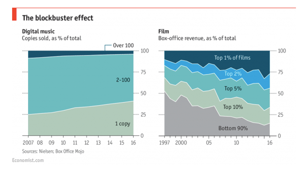 What we are left with, what sequels and reboots represent, is sort of cheese pizza entertainment -- the product with the highest possibility that the most people will like it. It would be pretty bogus to eat only cheese pizza; and actually, diversification is thousands of times more important in art than it is in pizza. Movies aren’t alone either. A recent Economist study found that what has happened since the music industry became digital -- ie. way more music became accessible to everyone -- is that, while more music is being listened to, the largest share of listening has actually shrunk to a smaller top musician group than before. Data has led streaming services to constantly recommend only cheese pizza, guaranteed-to-land artists.