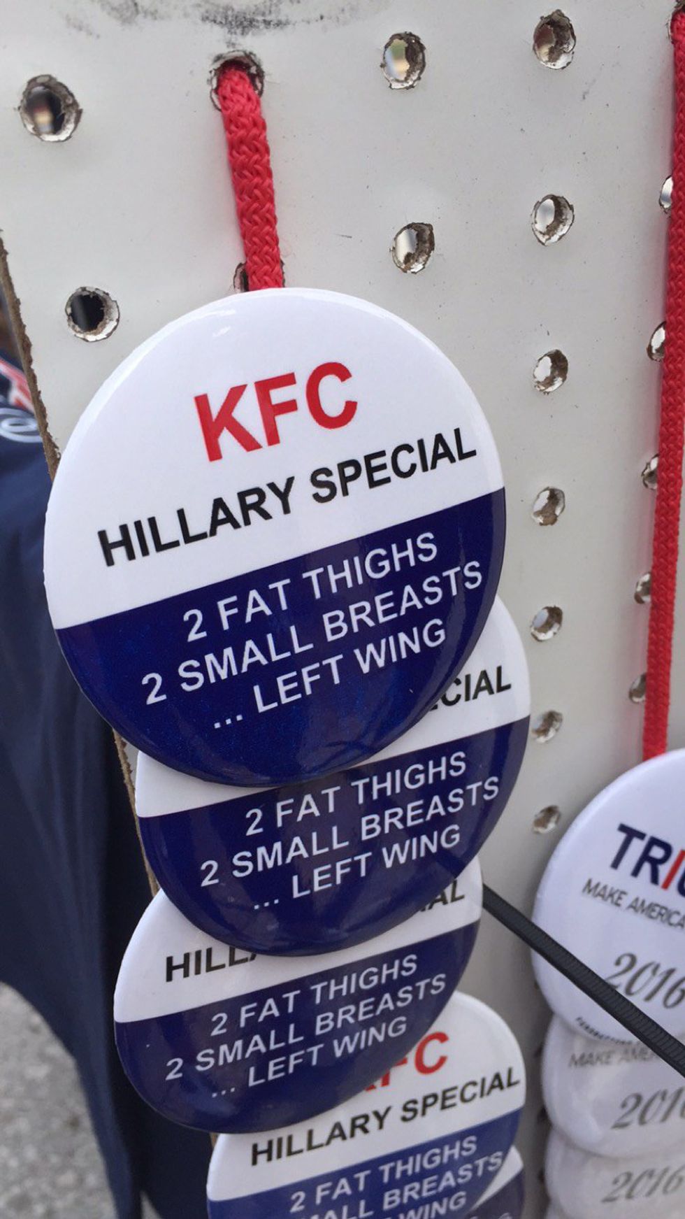 My first encounter was with a street vendor selling Trump paraphernalia. There were, or course, tee shirts, pins and hats of all shapes and sizes praising the name of “The Donald," which was expected. What I didn’t expect to see was the numerous pieces brandishing anti-Clinton sentiments. Many referred to her email scandal, which is understandable. However, I was disgusted to see pins attacking Secretary Clinton’s body (pictured below). Not only does this subject have no place in the discussion concerning potential candidates, it especially shouldn’t be on display and featured at another candidate's rally.