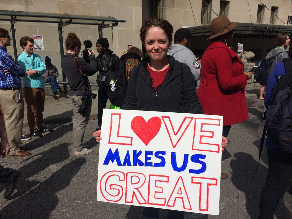 To clarify, not all of the protesters and supporters caused a stir. Many, I’m happy to report, were just there to exercise their rights to express themselves as voters, whether they were for Trump or against him. In fact, most supporters were high in spirits and many protesters carried signs bearing positive and encouraging messages (pictured below).