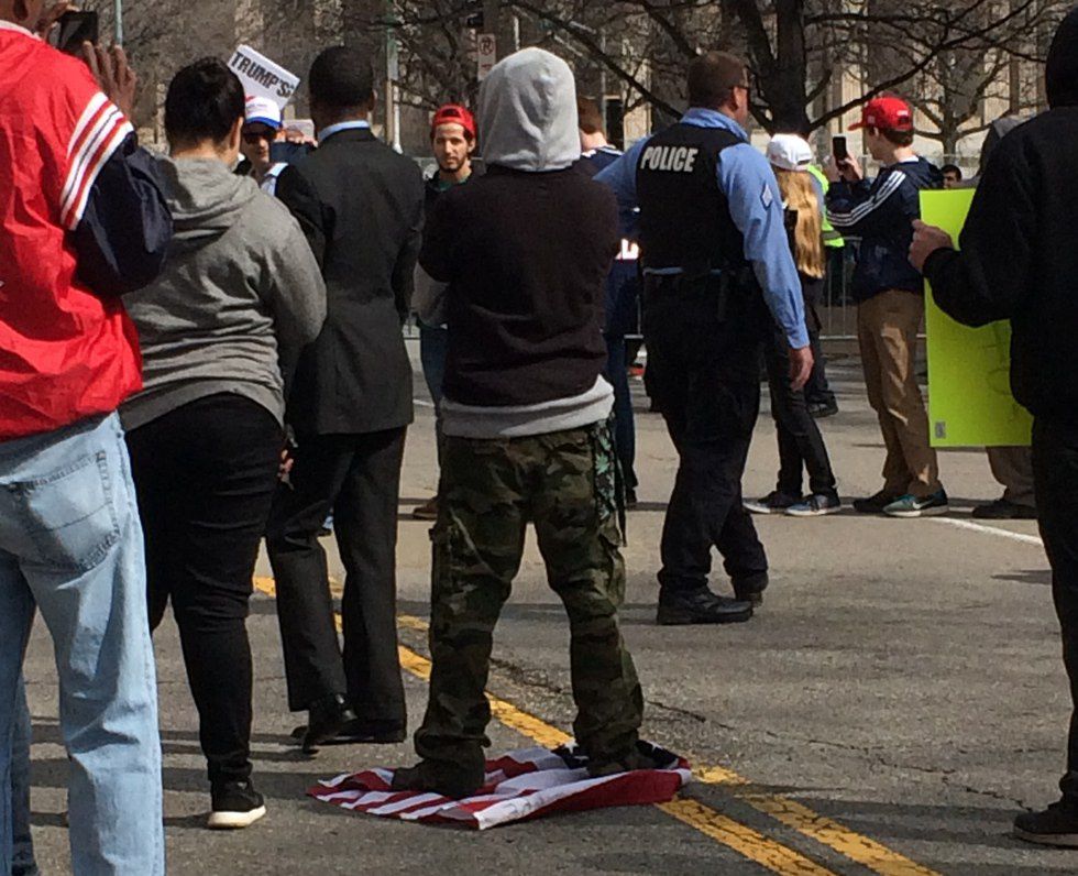 However, there were several individuals who expressed their opinions through anger and hatred (pictured below). One young man even stood on an American flag, greatly offending many people in line and, admittedly, myself (pictured below). As expected, this extreme action drew many screams and jeers from the people in the line and even, in extreme cases, supporters leaving the line to confront him, only to be separated by police. It was a scene that’s reminiscent of riots one would see on television, not before my own eyes on a sunny Friday morning.