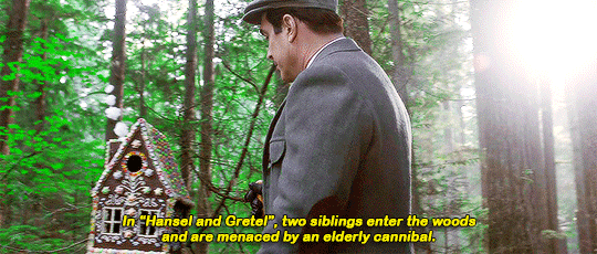 12. "In 'Hansel and Gretel', two siblings enter the woods and are menaced by an elderly cannibal."![]()