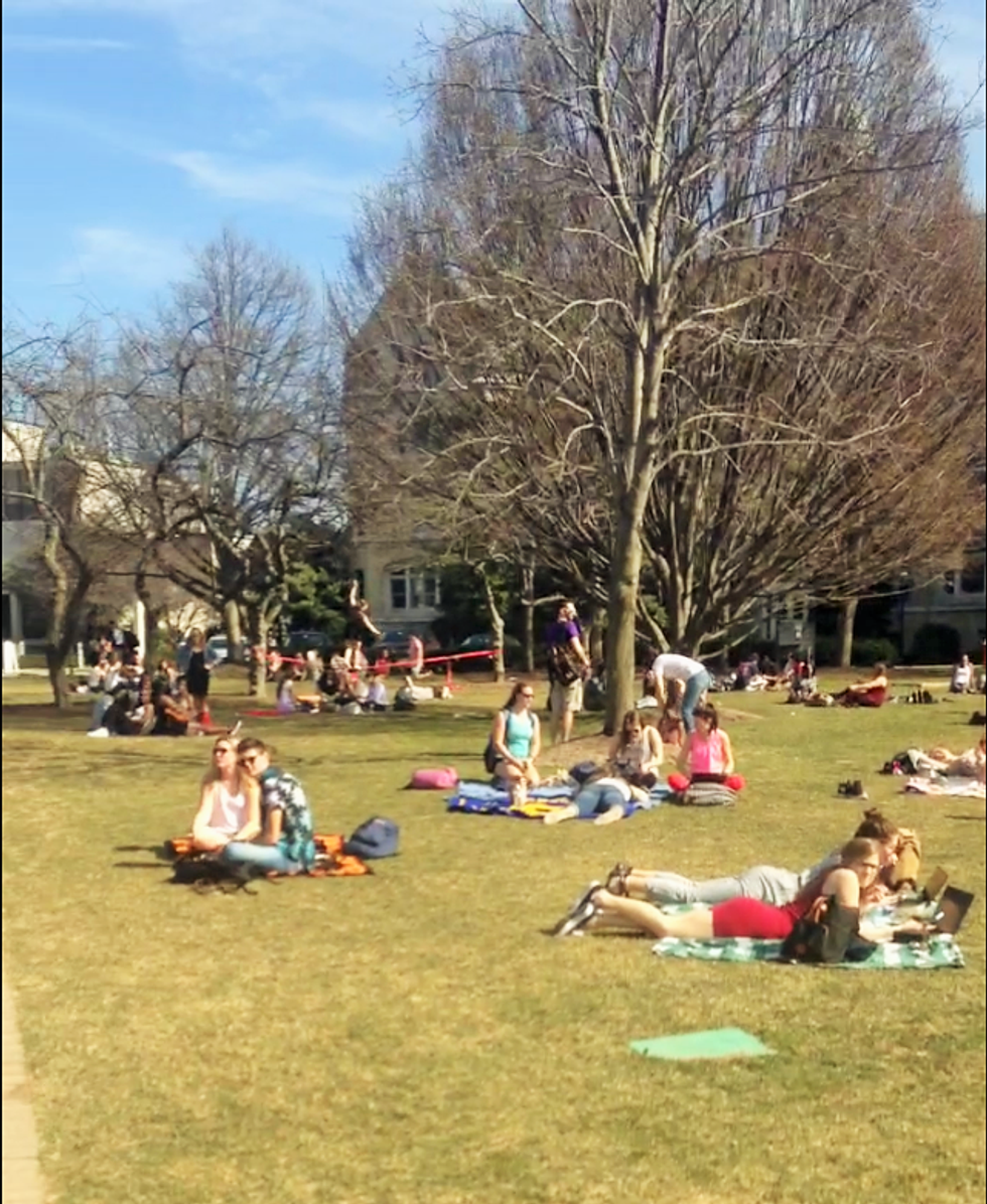 Students agree that the green is becomes an all inclusive day party. Chris McGee feels a “sense of unity after being cooped up alone all winter.” Despite spurts of warm weather, most students have been inside for the whole winter. Not literally, but with cold temperatures and no sun, students move as quickly as they can from building to building. Now, students are moving as quickly as they can from their beds to the green.