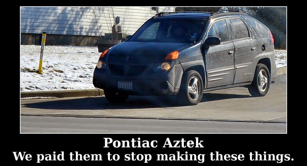 It's a given the Pontiac Aztek is on this list. You could even say it's cliche. The butt of every car design joke - of which there might be five - the Aztek is not only known for its role in Breaking Bad, but also as the vehicle that kicked off the crossover revolution. It also looks about as pleasant as cauliflower-ear.