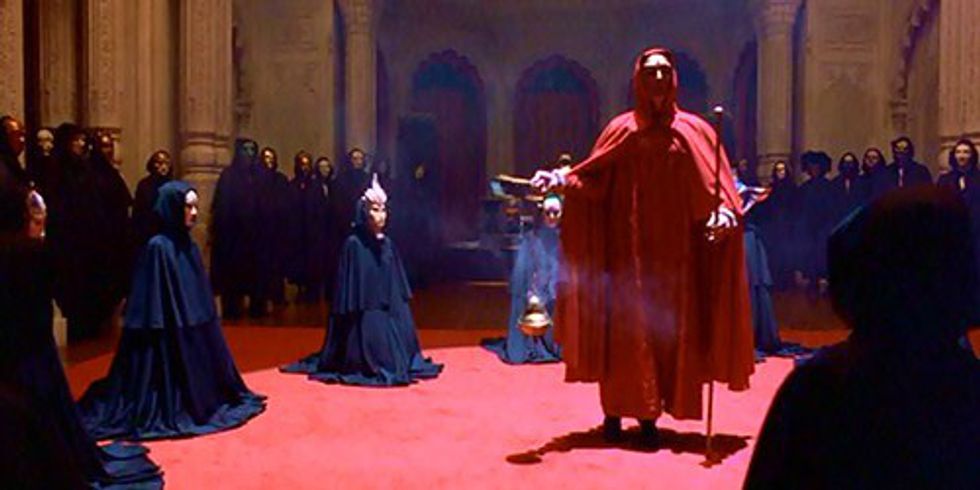 You could make the argument that the cult sequence objectifies people who only use sex for carnal purposes; isn’t this in itself pornographic? Yes, of course it’s pornographic, but at the same time, that does not make the movie porn. You see, the masquerade scene is not designed to sexually arouse the viewer like porn is; rather, it is designed to mock people who objectify others as sexual objects, and who only use sex as a means of superficial, carnal pleasure by painting them in a grotesque, evil light.