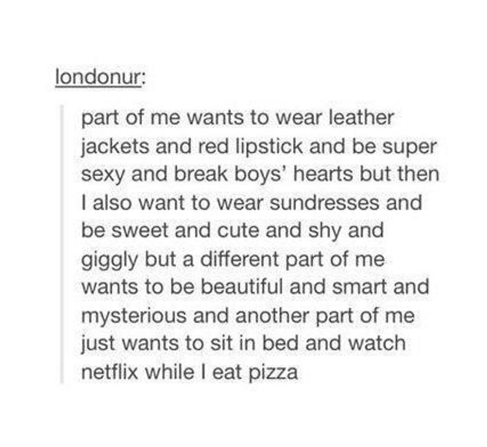 Why do we have this idea that we can't be smart, beautiful, mysterious women who wear leather jackets and sundresses and eat pizza while we break boys' hearts? If you're a feminist, the common perception seems to be that you can't appreciate chivalrous actions or want a husband, two kids, and a white picket fence. If you're attractive, you're less likely to be perceived as intelligent. If you're a woman who has or even talks about sex, people seem to think that's all you do.