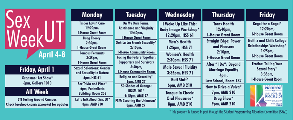 Every year, the University of Tennessee hosts "Sex Week". The event, organized by the student organization Sexual Empowerment and Awareness at Tennessee (SEAT), is an integral part of SEAT's mission to "foster a comprehensive ad academically-informed conversation about sex, sexuality and relationships…" University of Tennessee is not the first school to host such an event. Yale started the tradition in 2002 and it has been quickly adopted by other universities: Brown University, Northeastern, and Washington University in St. Louis are just a few who have adopted this tradition. The fundamental purpose of this event is to "foster dialogue and awareness about sexual health issues".