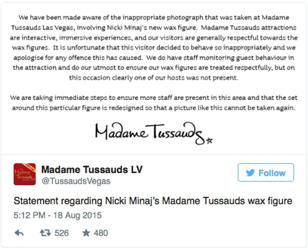 Nicki Minaj's wax figure debuted at the Madam Tussaud's museum in Las Vegas on Aug. 4th and, since then, has sparked controversy. The website highlights the artistry, dedication, and time taken to recreate a figure that capture the likeness of Minaj, but ignored the bigger picture. Literally. The figure bearing a vague resemblance to the rapper is provocatively and suggestively depicted on all fours.
