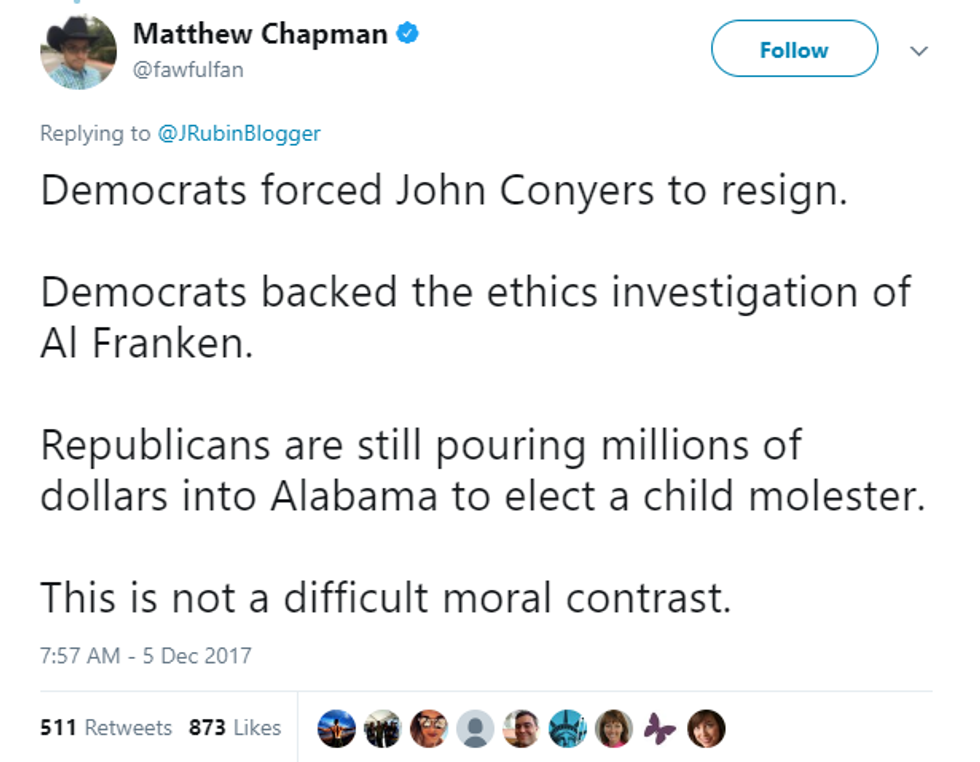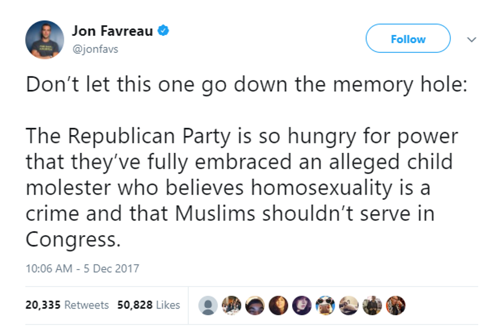 Many Democrats took to Twitter to express their horror at the "hypocrisy" of the Republican Party for forcing Al Franken out of Congress for allegations that paled in comparison to the allegations against Donald Trump or Roy Moore. Late-night comedian and talk show host, Trevor Noah, even went as far as to say that if Franken was a Republican, he would still have a job.