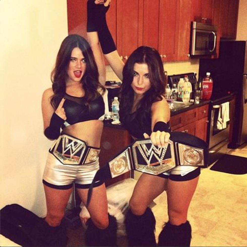 This has been on my list for a year now. I always wanted to do it in college because it's super unique but still very cute and relatable. You literally just need silver spandex, a black crop top and the WrestleMania belt. You can even make one on your own with aluminum foil, or you can go into the little kids' section at Walmart and pick it up. No biggie. It'll be a man fave and a kid fave costume. Win-win!