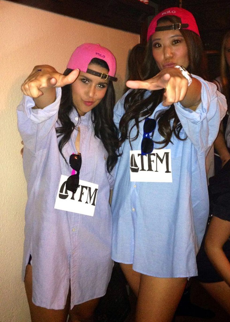 So you can kind of go off of the other with these two costumes. The first picture is "Risky Business" and all you need is a white collared shirt. I suggest you ask any of your guy friends to lend you one since you want it baggy enough to wear as a dress. You then can put on some high socks, sneakers and sunglasses and you're ready to chill at home like Tom Cruise. The second picture is a frat boy. People usually wear colored collared shirts as dresses, which is another item you'll need to borrow, and also a cap that you wear backwards. Super easy and super cute, no worrying needed!