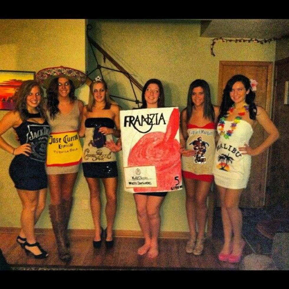 This is actually one I'm doing with my suitemates. Not only is it a great solo costume but it's even more fun with a group! You just need a dress that's the color of the certain bottle you want to be. For instance, I'm going to be Patron so I'm wearing a white dress. Since Patron has a green ribbon around the top, I bought a 55-cent lime-green lei and I'm pairing it with the dress. I'm printing out the Patron label and I'm ready to hand out some shots!
