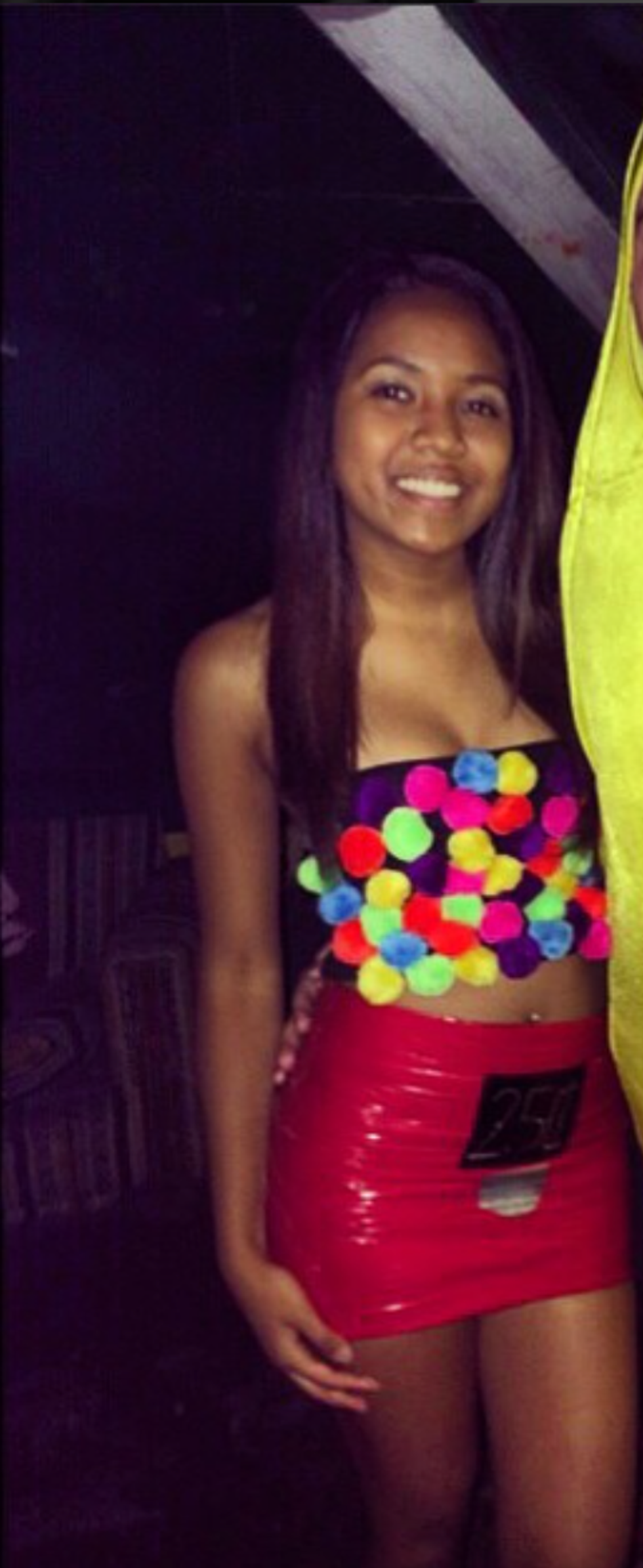 So this is my roommate Lani, and I actually helped make her costume. She found a black bandeau just lying around her drawer and a plain black mini skirt. She bought colored pompoms, glue, red duct tape and a silver sharpie. She put on the bandeau and I measured the width of where we were going to place the pompoms so her arms moving from side to side wouldn't brush them off. She also tried on the skirt (right before going out) and duct taped around the skirt, ensuring she would not get out of the skirt that night (we wound up cutting her out of it.) Then I just drew on the 25 cents and the little dispenser box and she was ready to party!